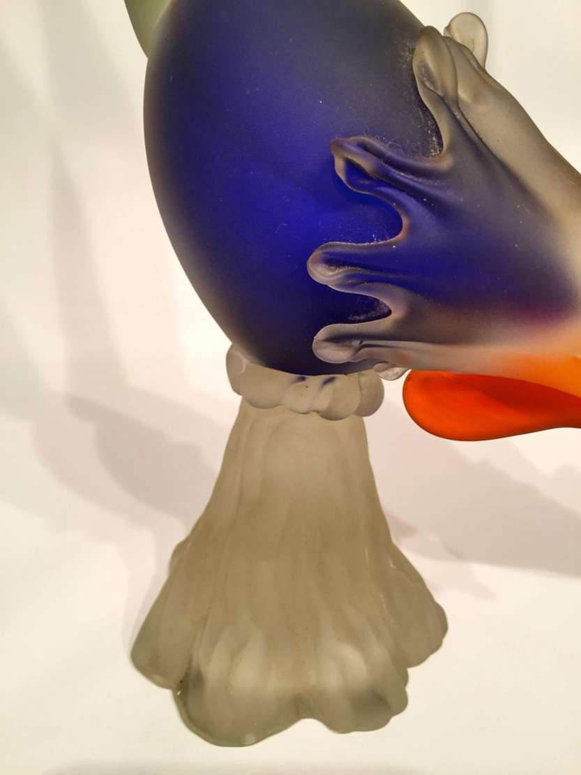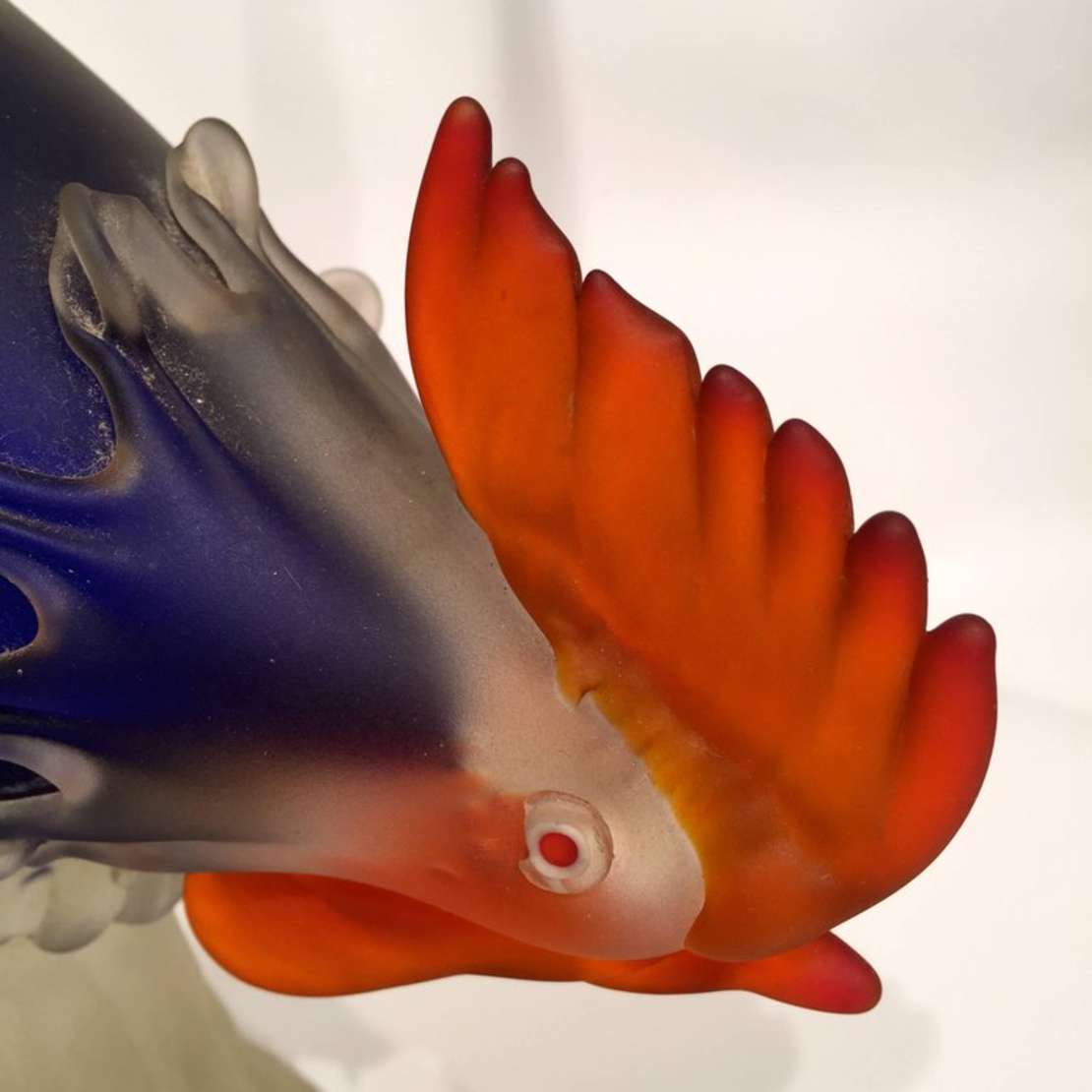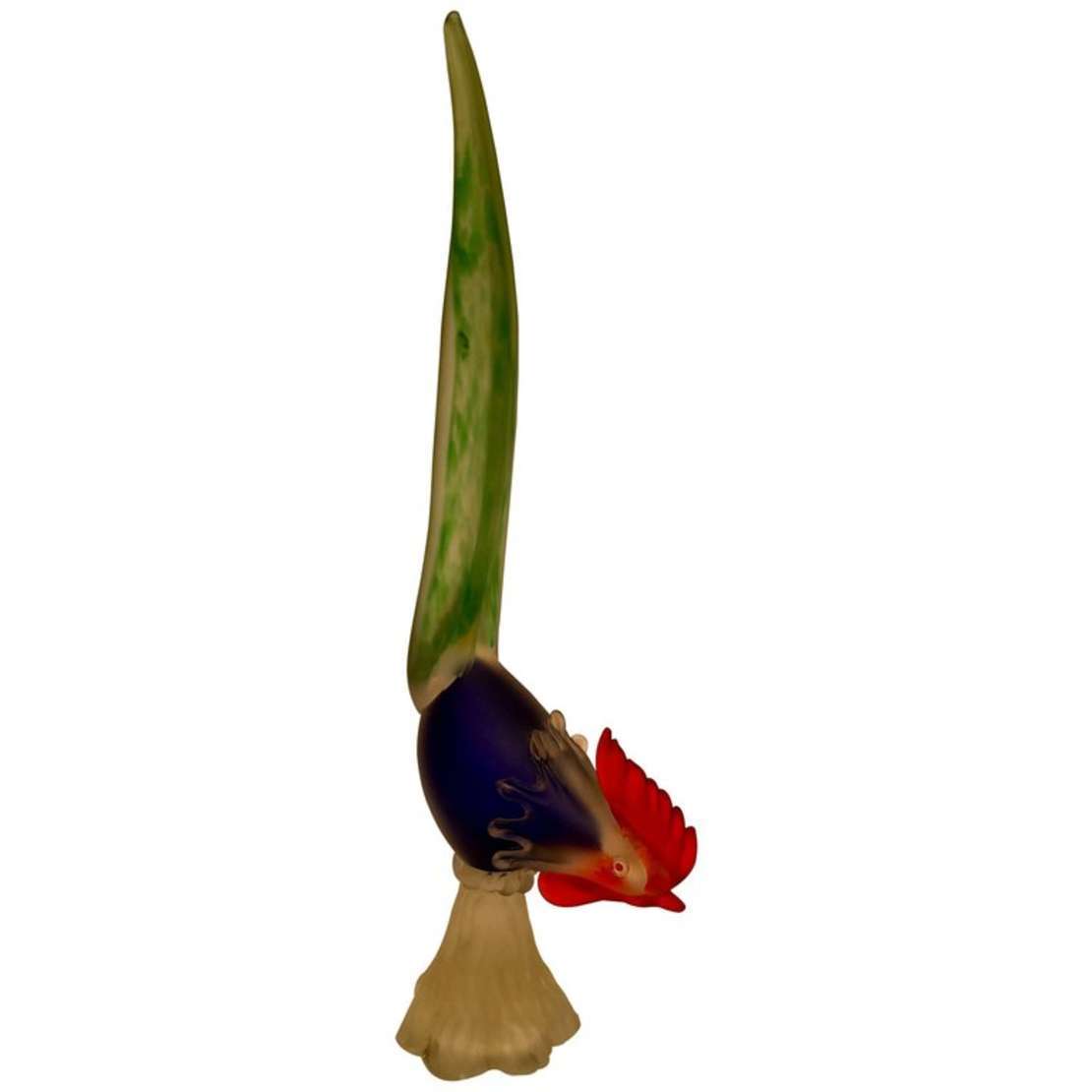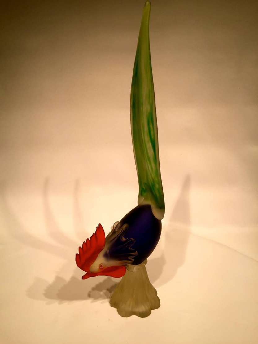 Escultura de faisão em vidro artistico soprado de Murano nas cores verde, azul e vermelho. Vidro satinado com crista e base aplicados a quente. Desenhado e produzido por Seguso Vetri D'Arte em 1950. Medindo 45 x 11 x 19 cm.