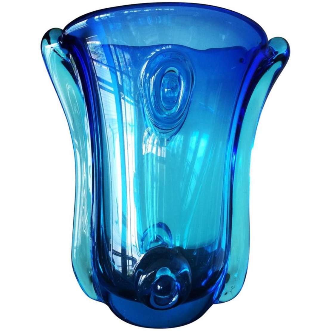 Vaso em vidro artistico soprado de Murano na cor azul com repuxados em todo o corpo. Desenhado por Ercole Barovier e...
