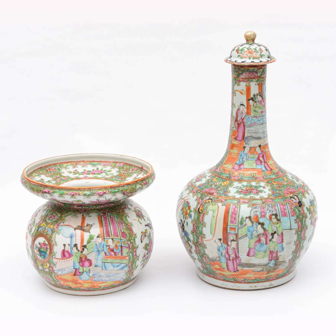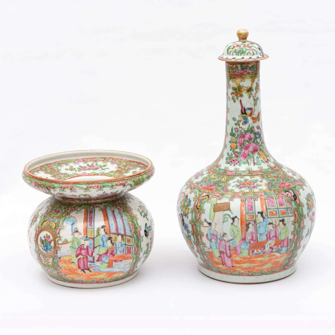 em porcelana chinesa no padrão Mandarim com farta esmaltagem de flores e reservas com personagens. Período Republican...