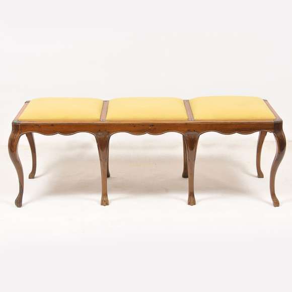 Banqueta de três lugares em madeira nobre no estilo inglês com assentos forrados em tecido na cor amarelo.