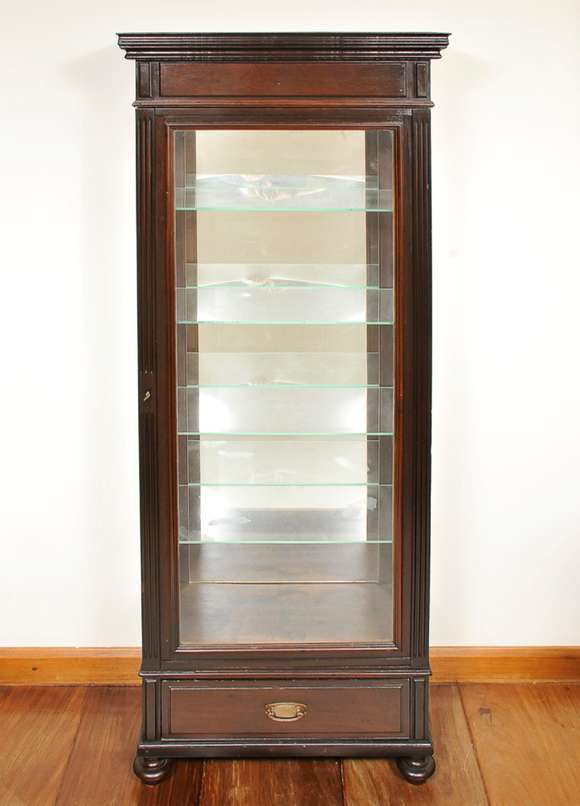 Vitrine em madeira nobre estilo inglês com porta de vidro, cinco prateleiras e uma gaveta embaixo com puxador de met...