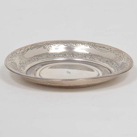 Pequena salva "Porta Alianças" circular em prata brasileira lavrada - Borda larga ornada por frisos com folhagens gra...