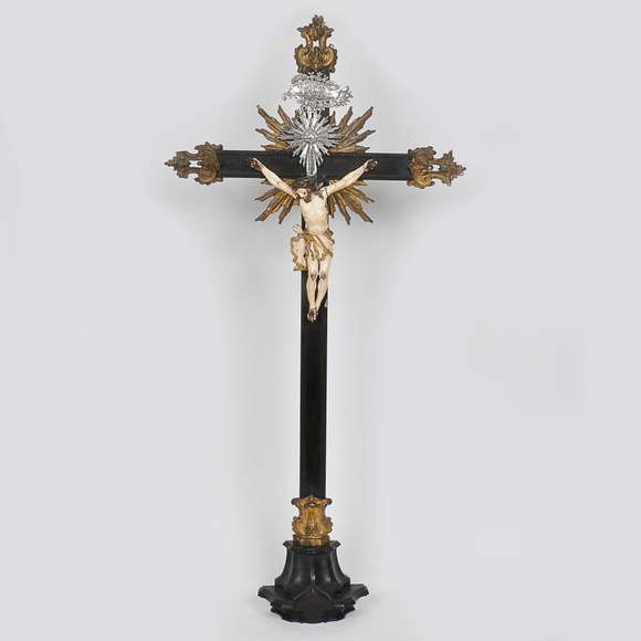 Imagem representado Cristo crucificado em marfim, com policromia e detalhes em ouro, Indo-português. Cruz em madeira ...