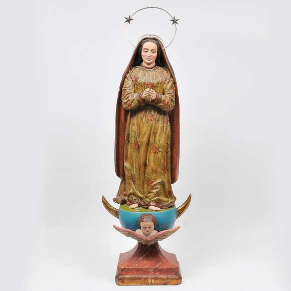 Imagem Portuguesa em madeira policromada e dourada representando N. Sra. da Conceição em sua tradicional postura, com...