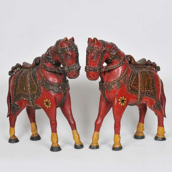 Par de esculturas orientais em madeira nobre patinada nas ores vermelha e amarelo com rica policromia e entalhes repr...