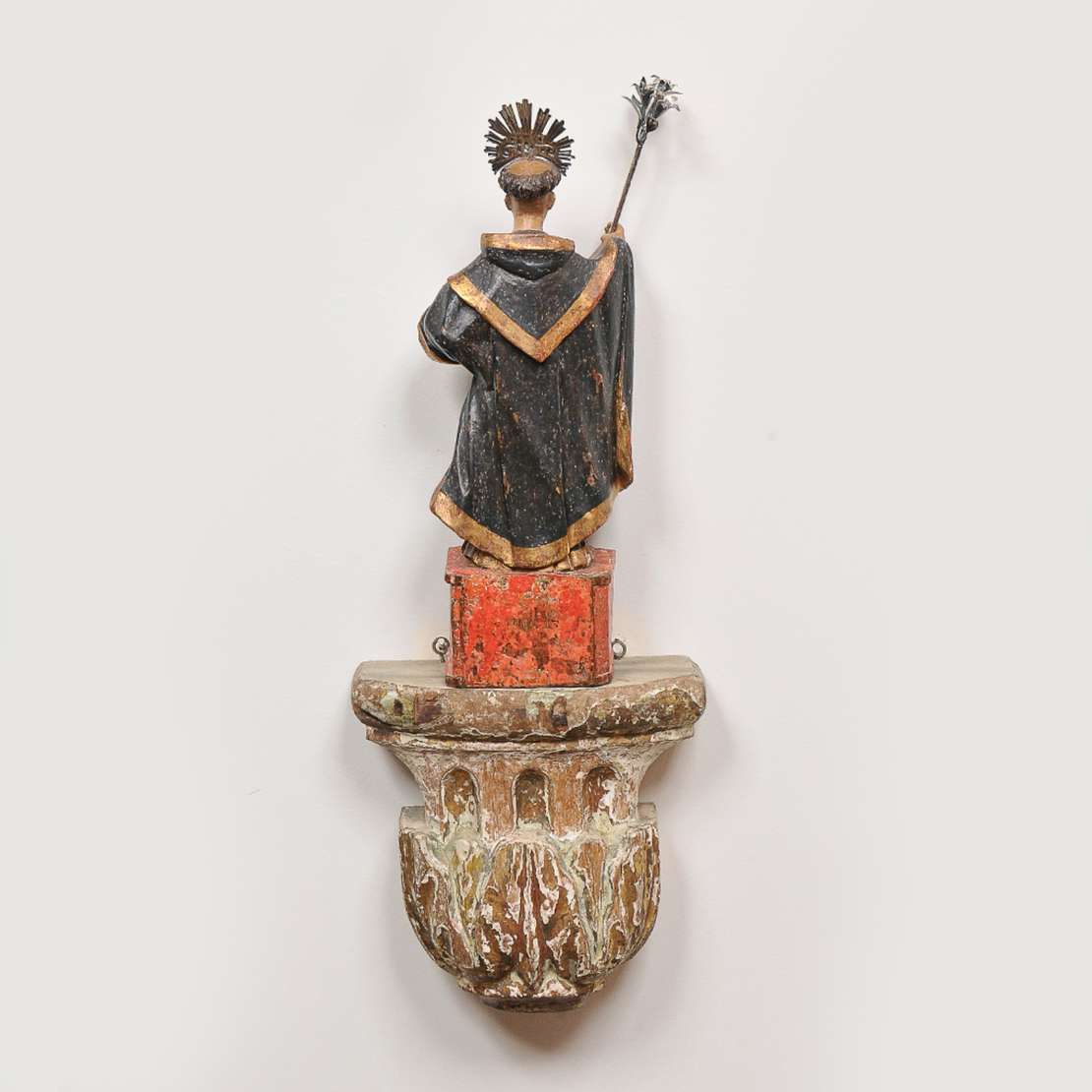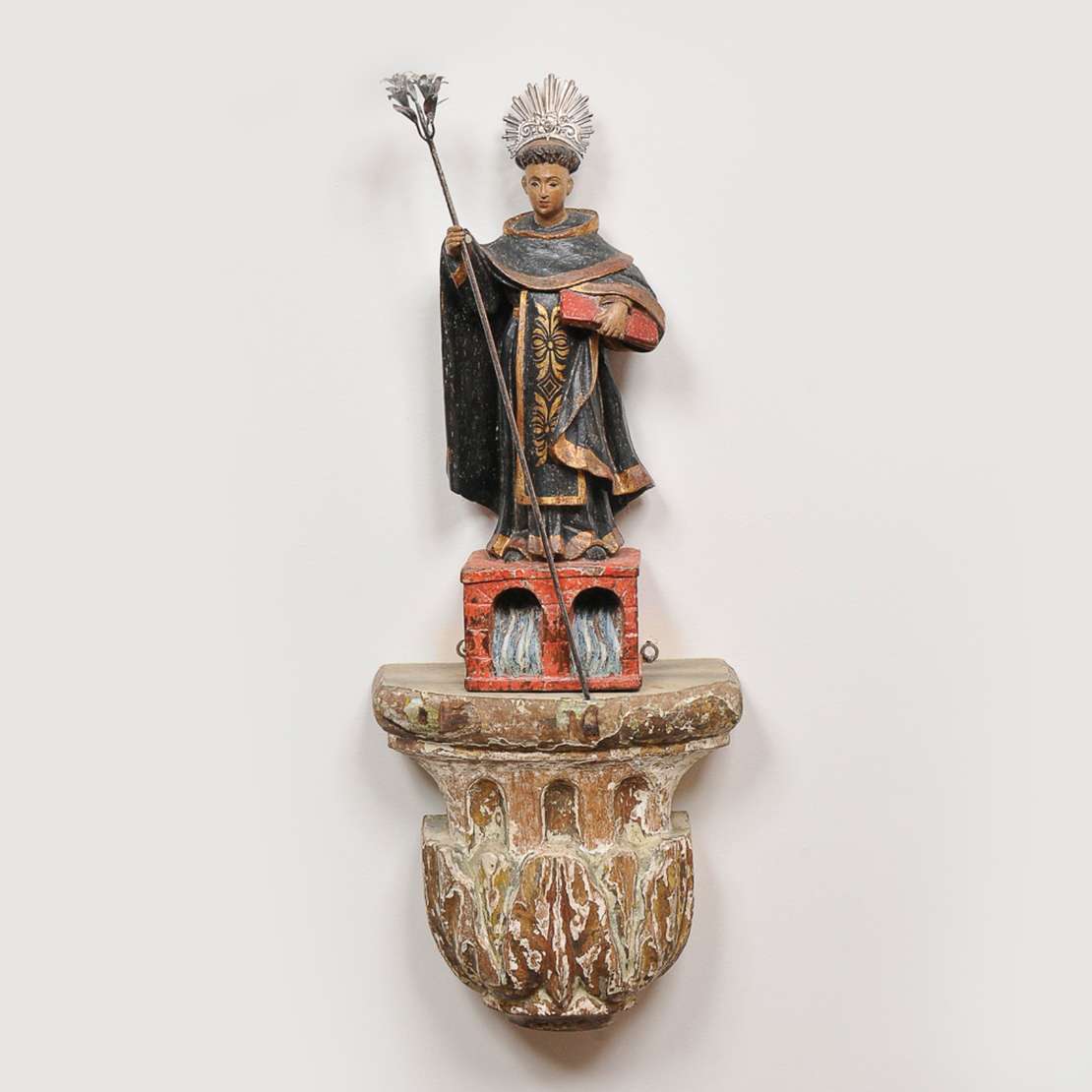 Imagem brasileira representando São Gonçalo em madeira dourada e policromada. Acompanha resplendor e lírio em prata.