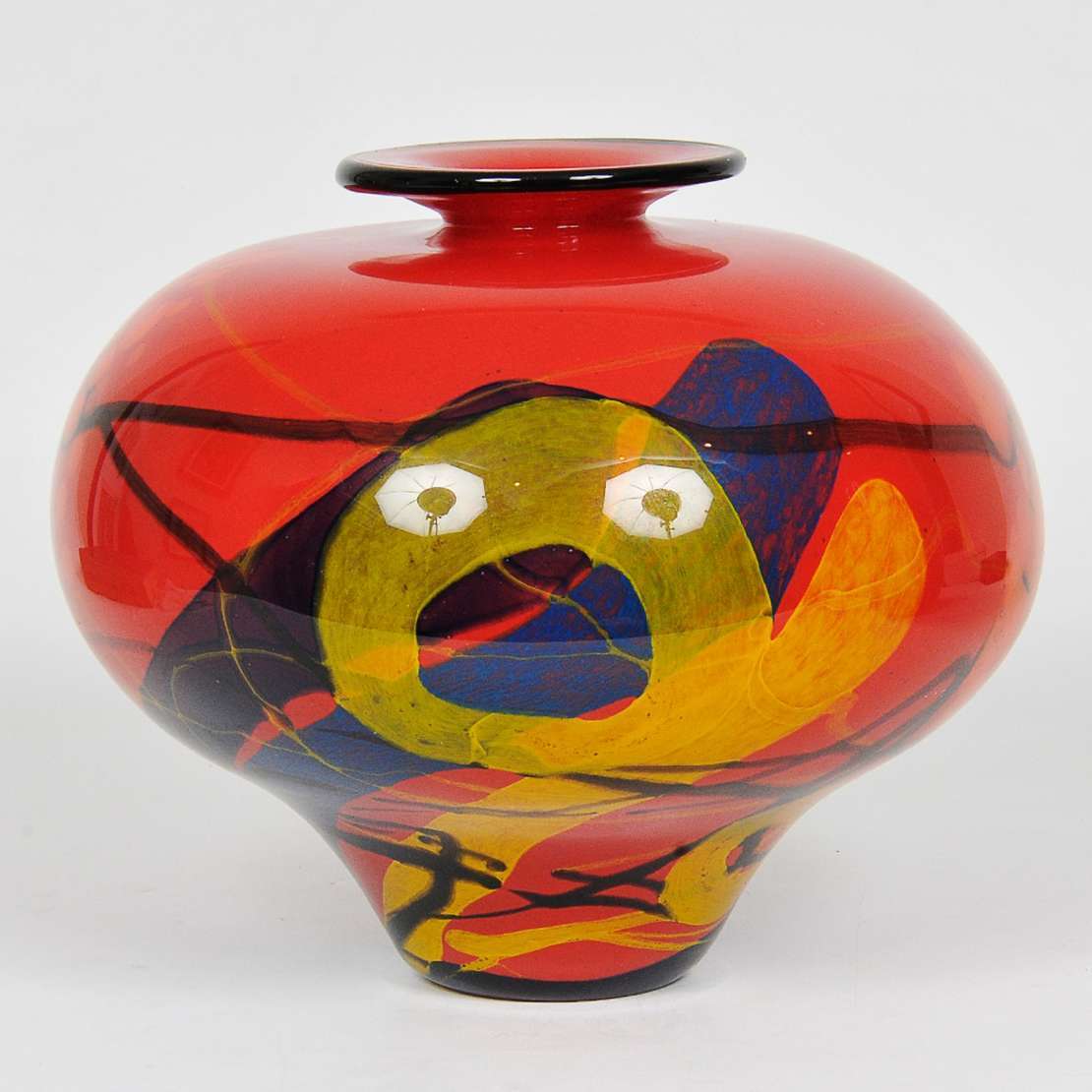 Daum Nancy. Vaso francês em cristal satinê decorado com folhas e flores nas cores verde, vermelho, laranja, amarelo e...