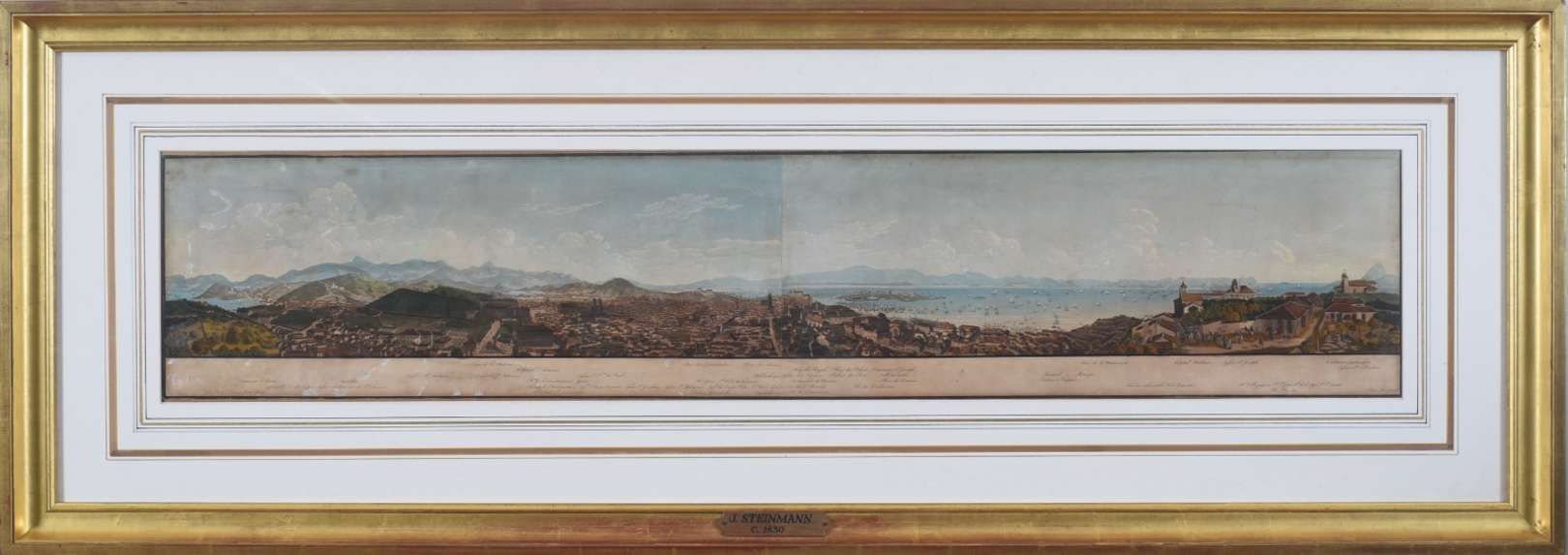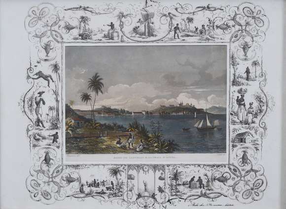 Litografia aquarelada22 x 30 cm (medida externa). Cercada nas pranchas por uma moldura decorativa na qual se misturam...