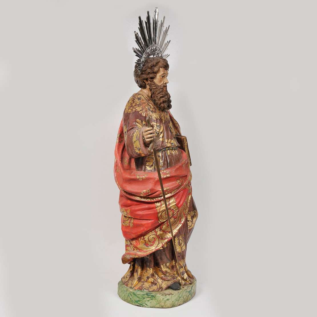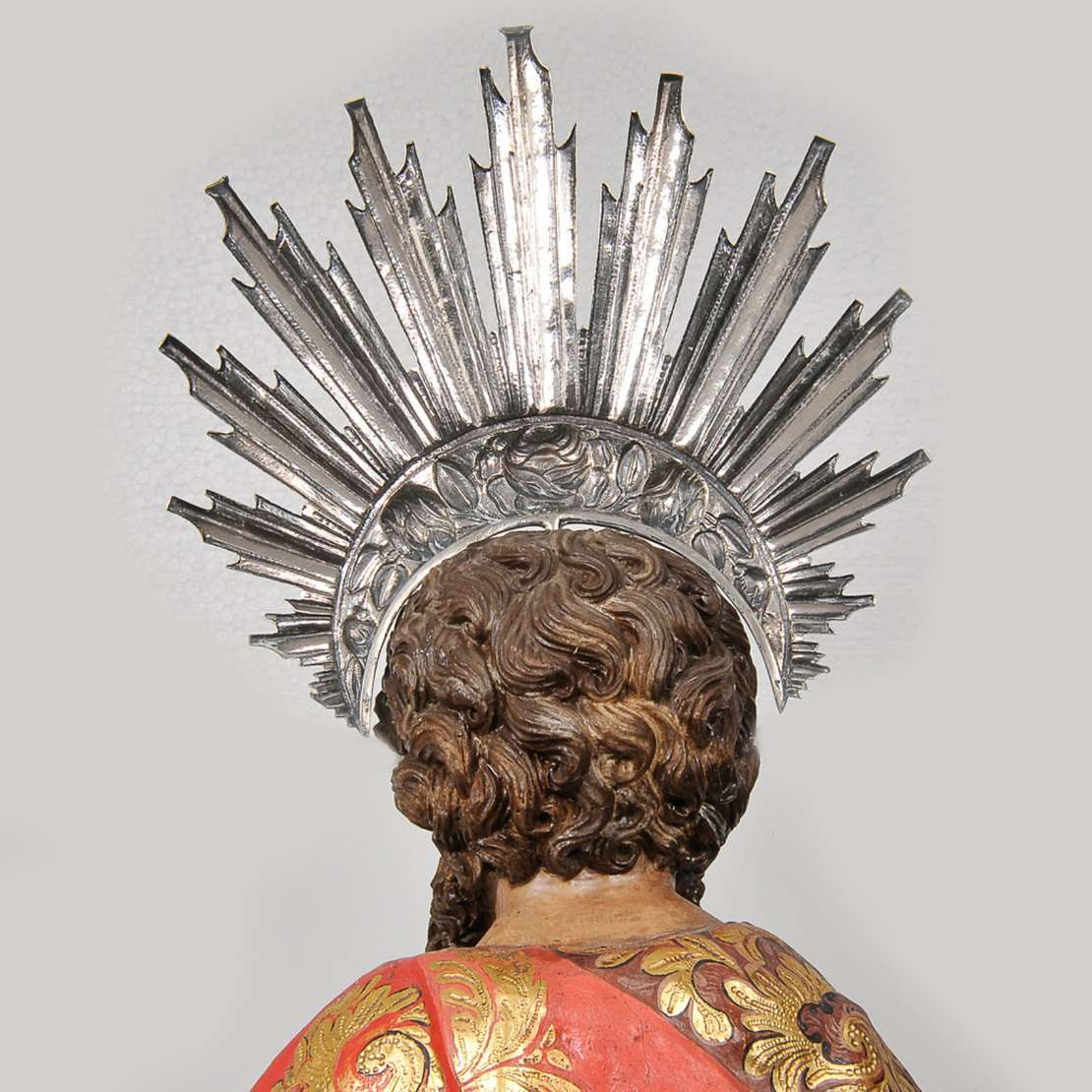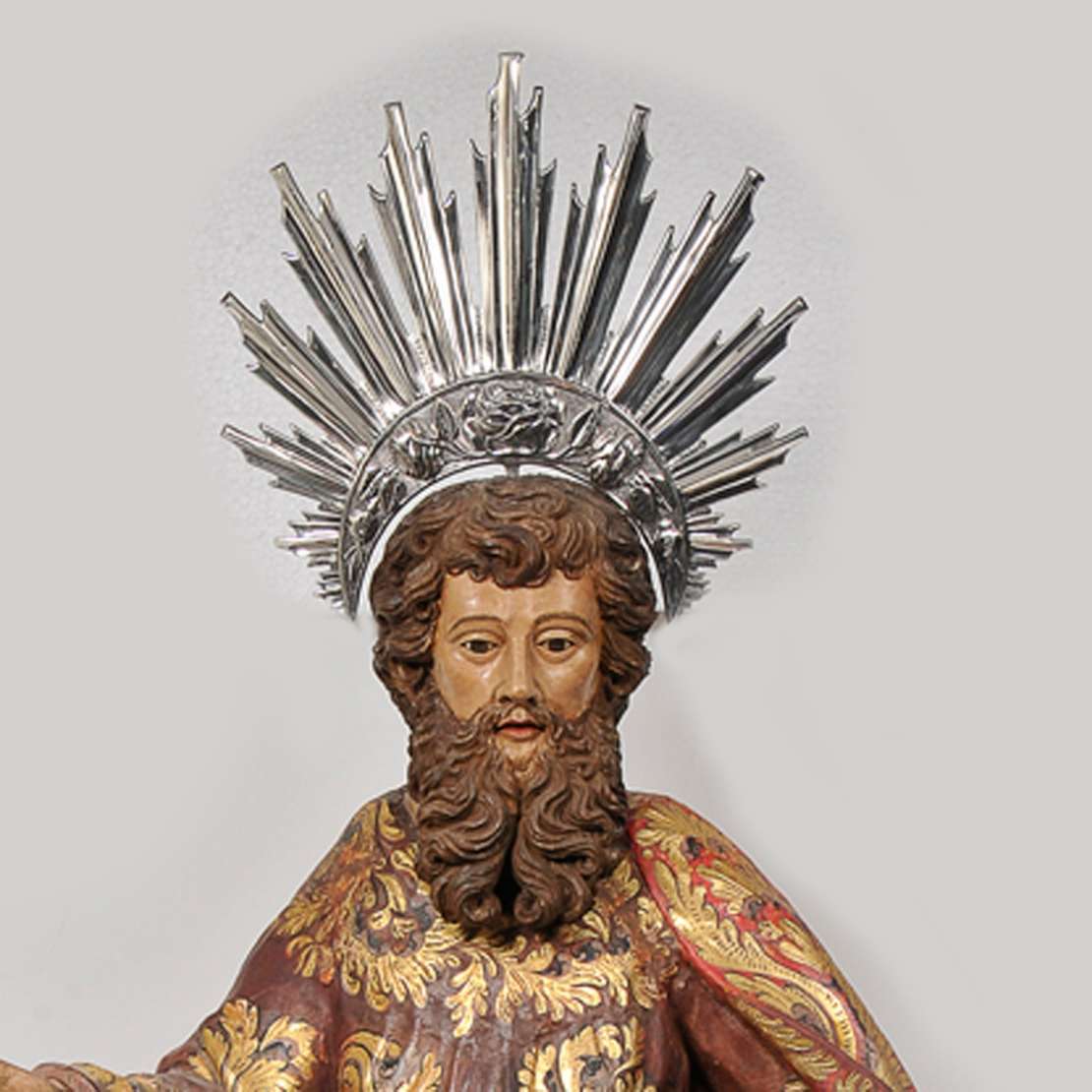 Imagem brasileira em madeira policromada, com resplendor de prata de lei medindo 69 cm