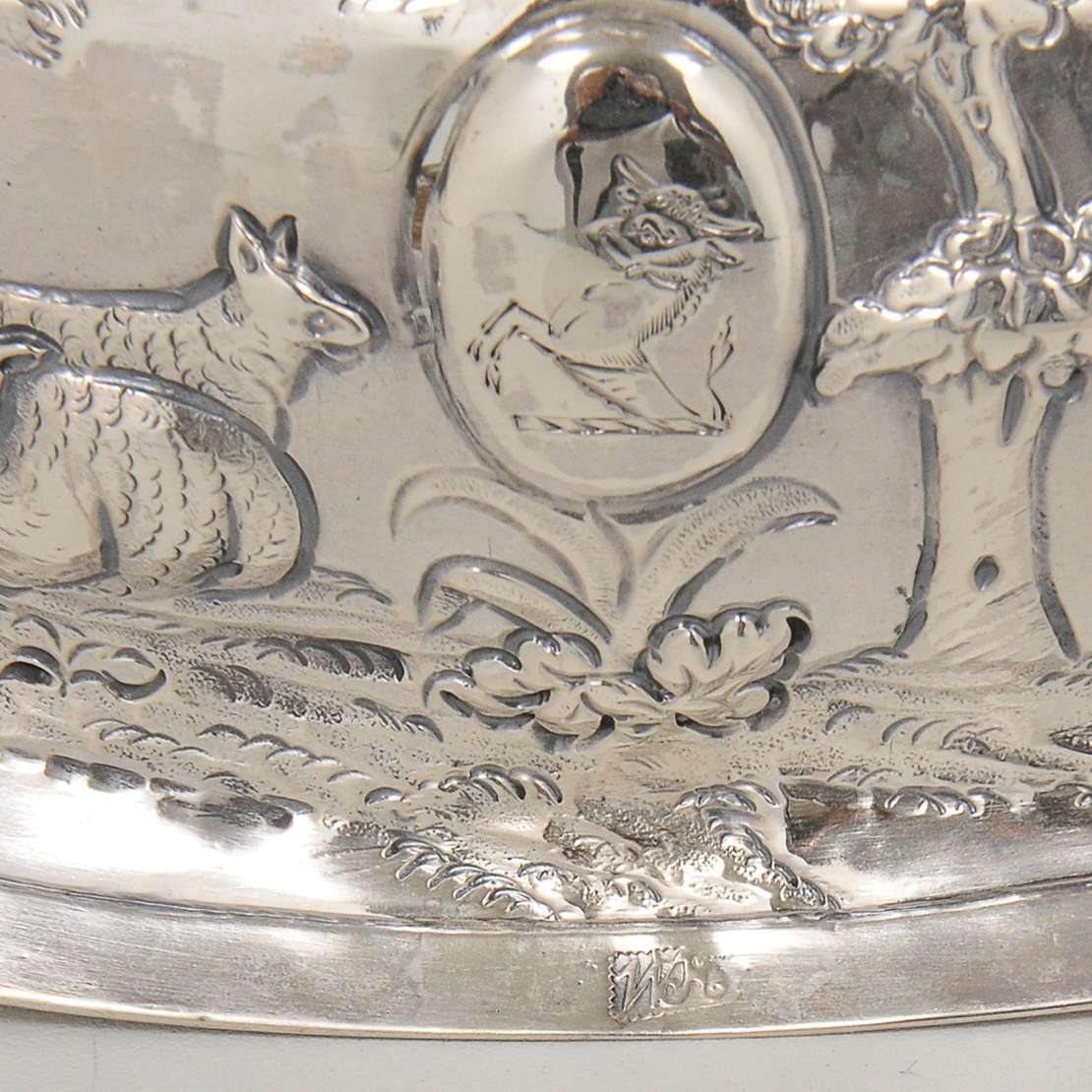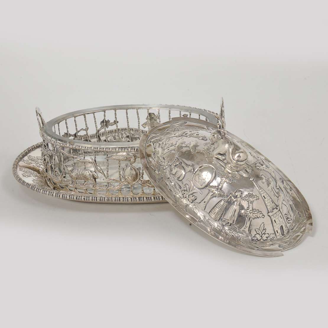 Paliteiro em prata brasileira lavrado com pássaro e frutas sobre adorno piriforme e pedestal. Base circular com galer...