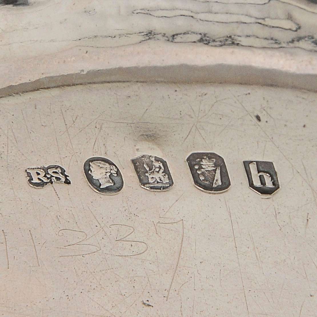 Salva em prata inglesa repuxada e cinzelada, ornamentada por borda recortada em suaves gomos lisos. Centro gravado co...