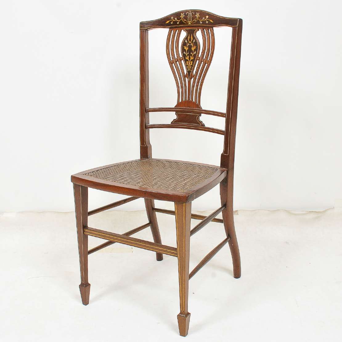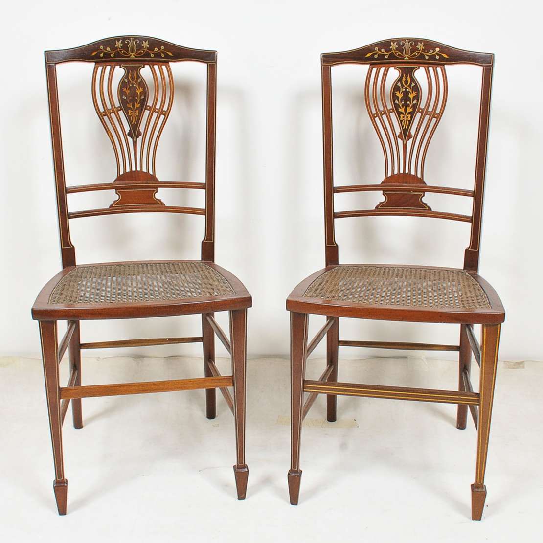 Par de cadeiras francesa estilo império em madeira nobre entalhada com assento e encosto forrado em palhinha natural.