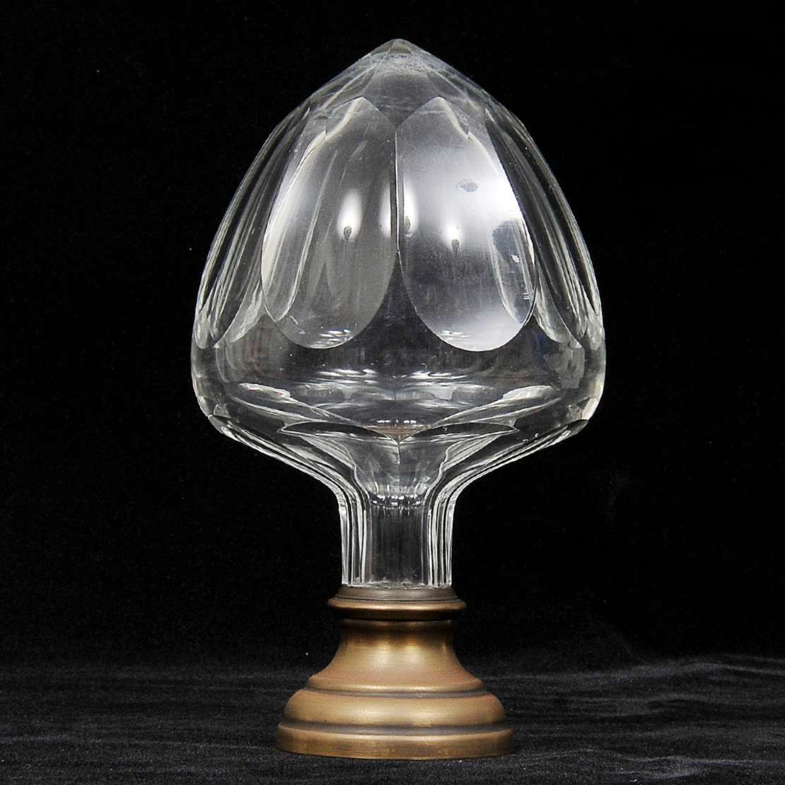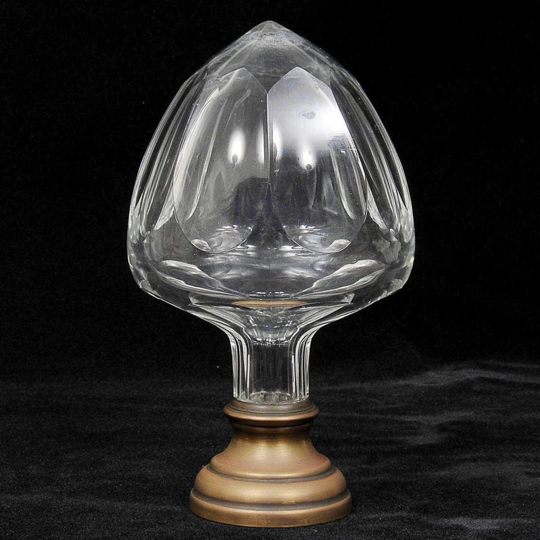 Pinha de coleção em cristal europeu, translúcido, lapidação dedão, base facetada, com pés em metal dourado.