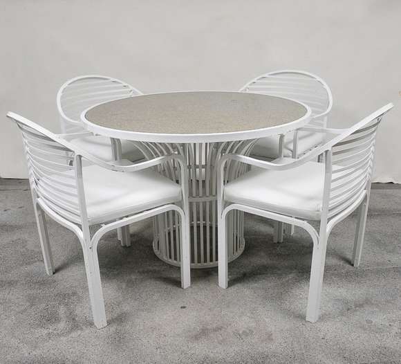 Mesa de jardim confeccionada em ferro patinado na cor branca com base da mesa cercadura vazada e tampo em mármore raj...