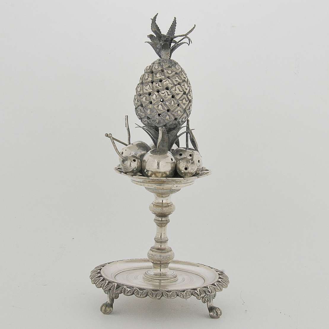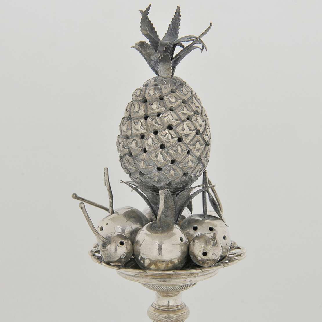 Paliteiro em prata brasileira lavrado com pássaro e frutas sobre adorno piriforme e pedestal. Base circular com galer...