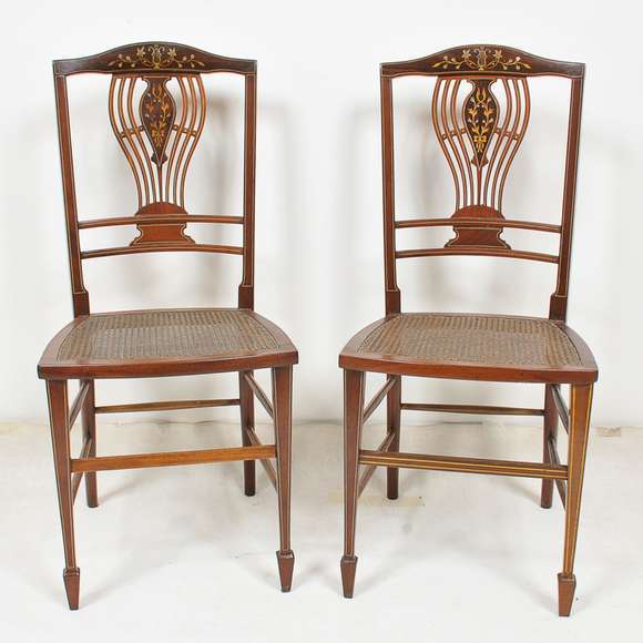 Par de cadeiras em madeira nobre com assento em palhinha, encosto vazado com detalhes em marqueterie de motivos flora...