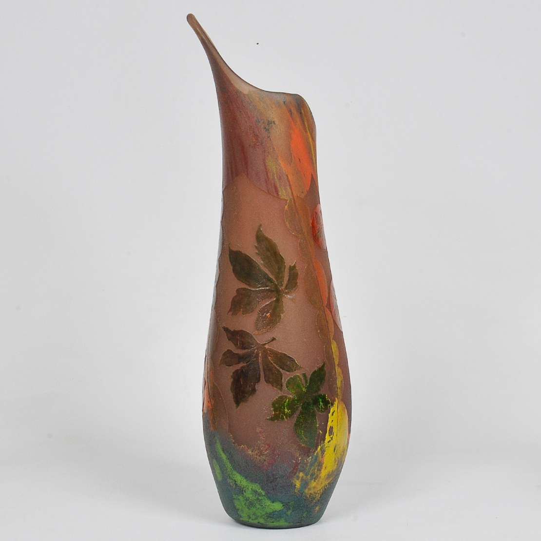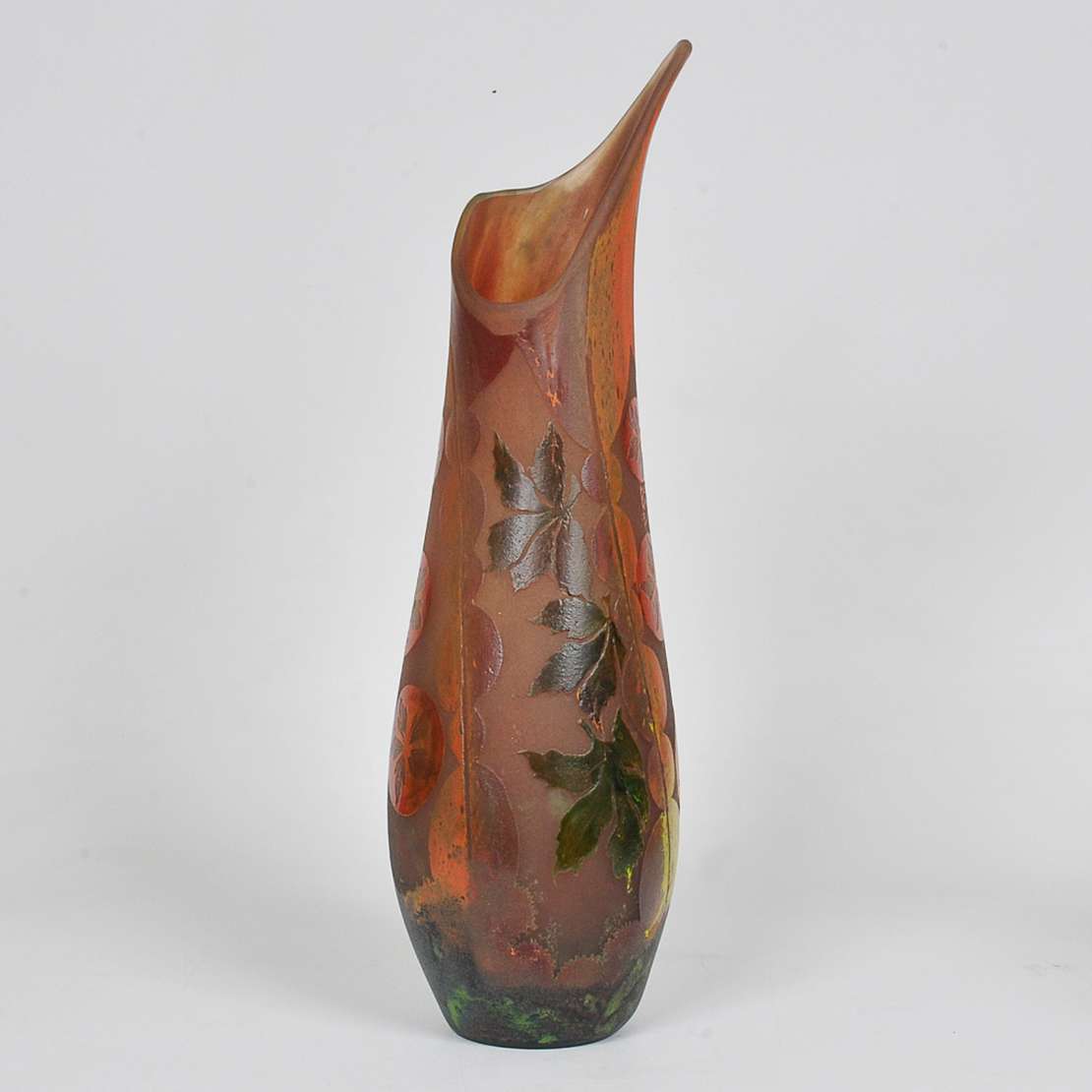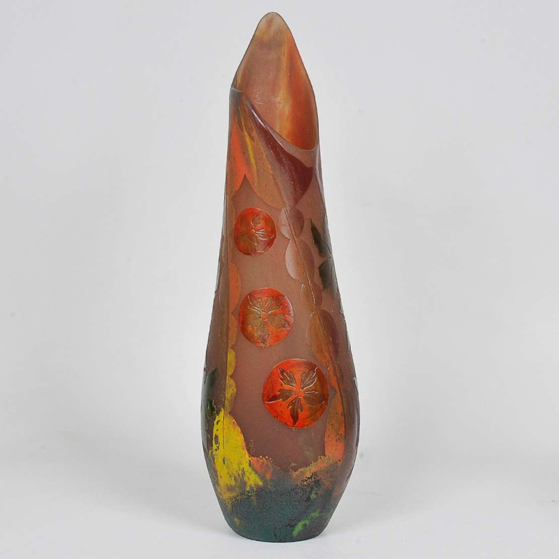 Grande vaso bojuda em vidro artístico de Murano multicolorido com detalhes de filete preto na borda.
