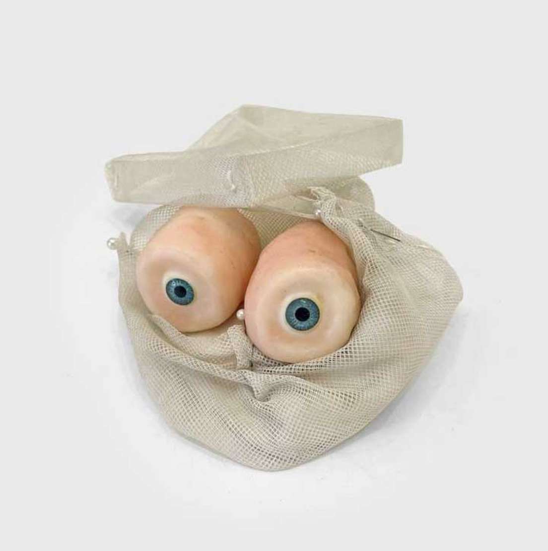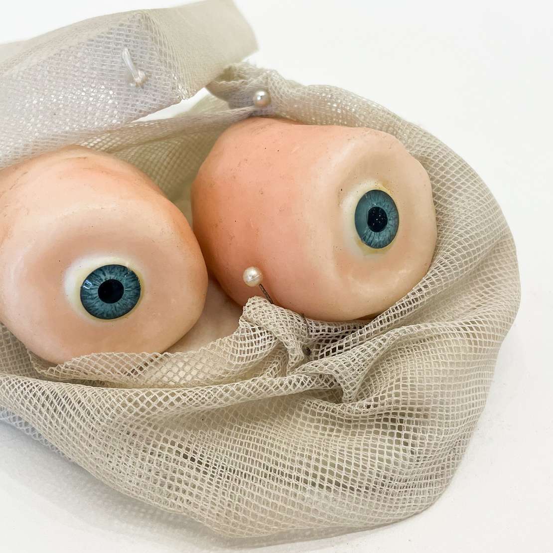 Cera com olhos de boneca, alfinete, pérola, Acrilan e tule.