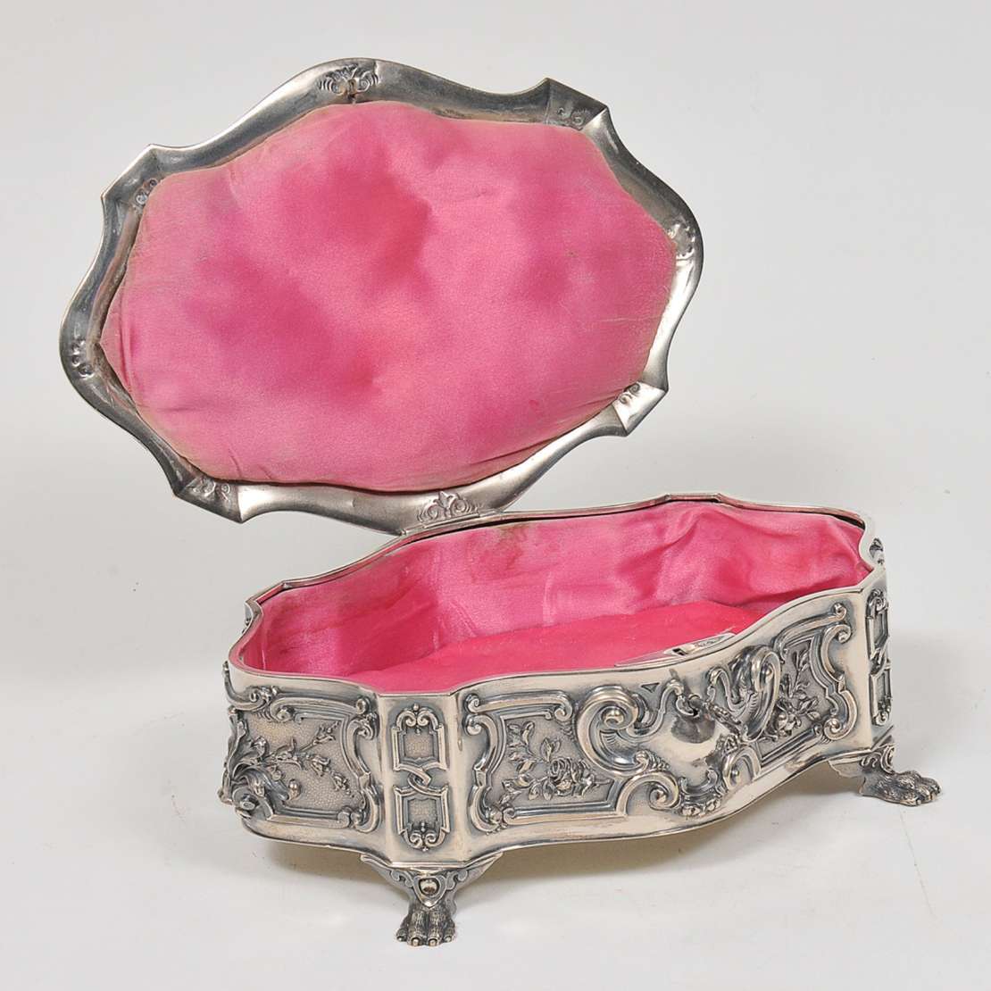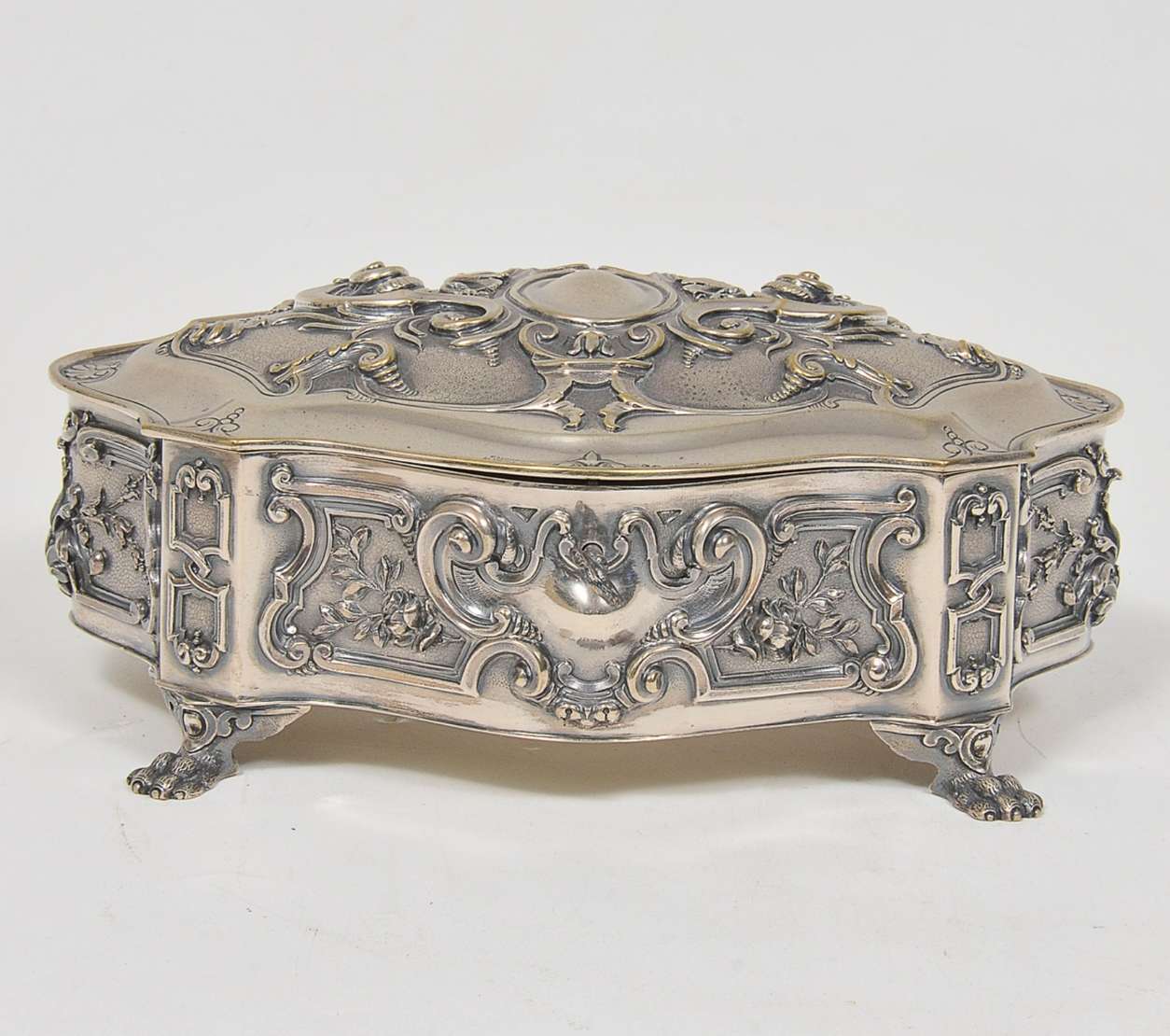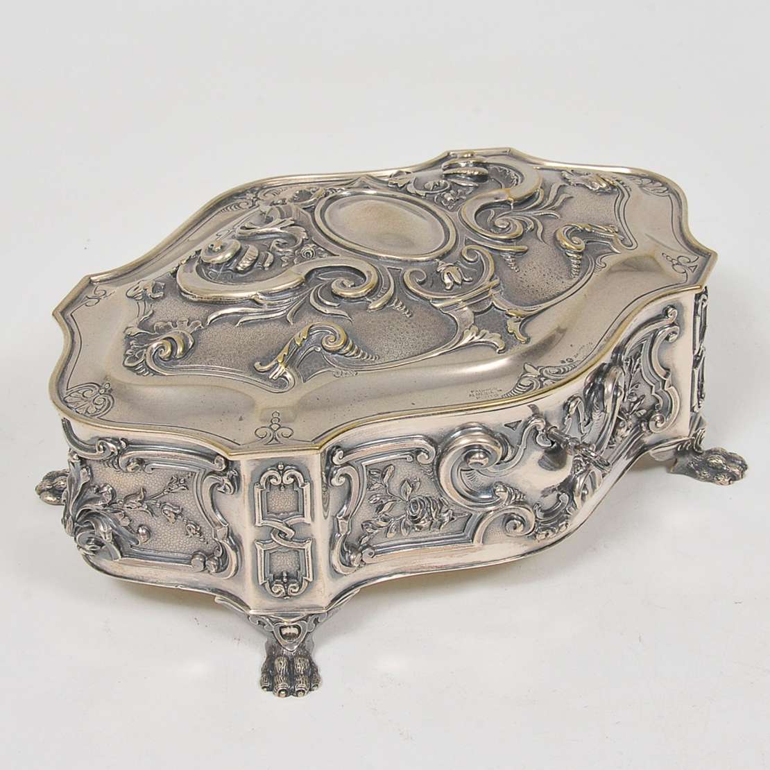 Caixa retangular chanfrada em prata inglesa lavrada e cinzelada, ornamentada por cenas medievais de caça, com aves e ...