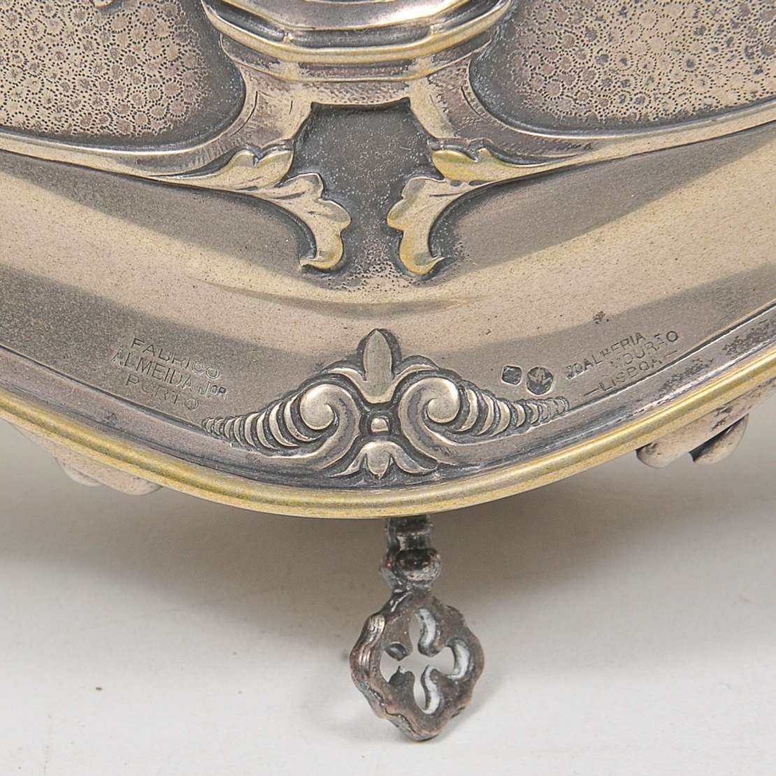LUIS FERREIRA - Bandeja oval em prata portuguesa com centro liso, ornamentada por galeria vazada em treliças arqueada...