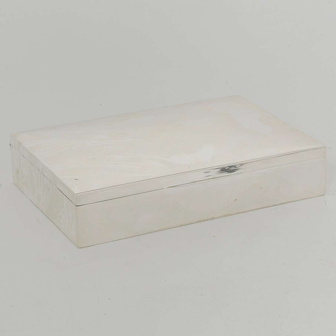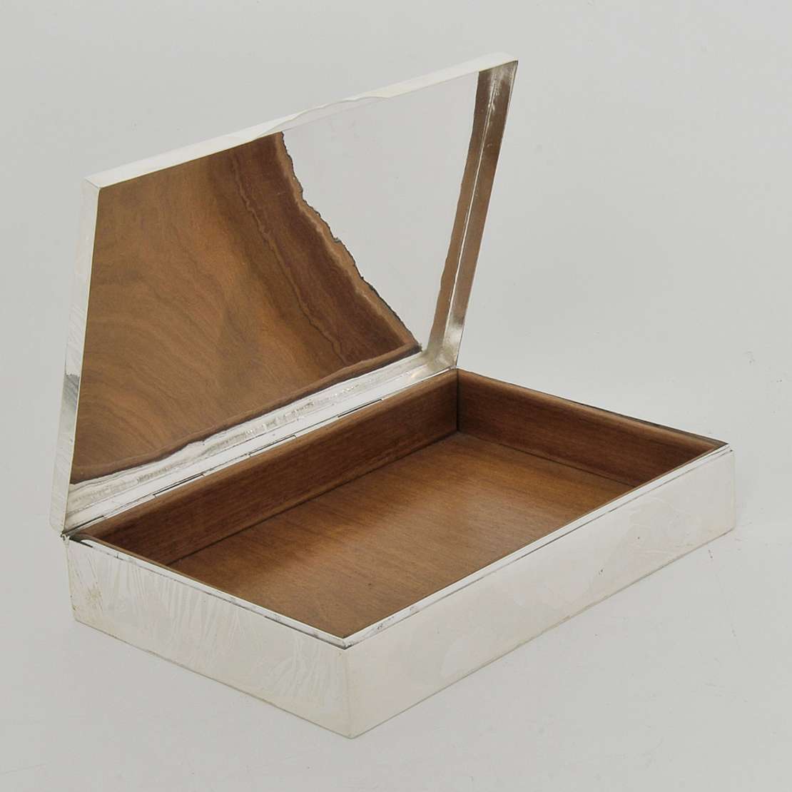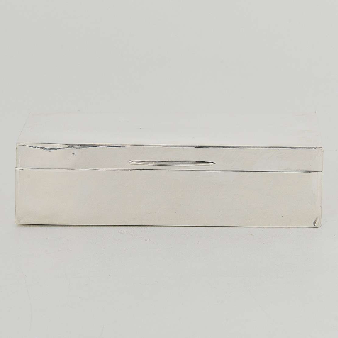 Caixa retangular para cigarros, de mesa, em prata inglesa lisa. Interior forrado em cedro. Tampo lavrado com fino gu...