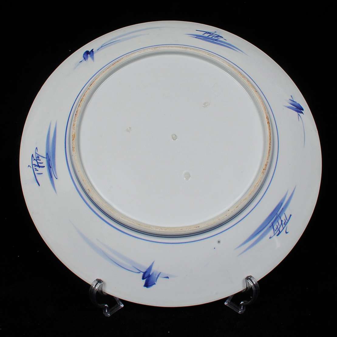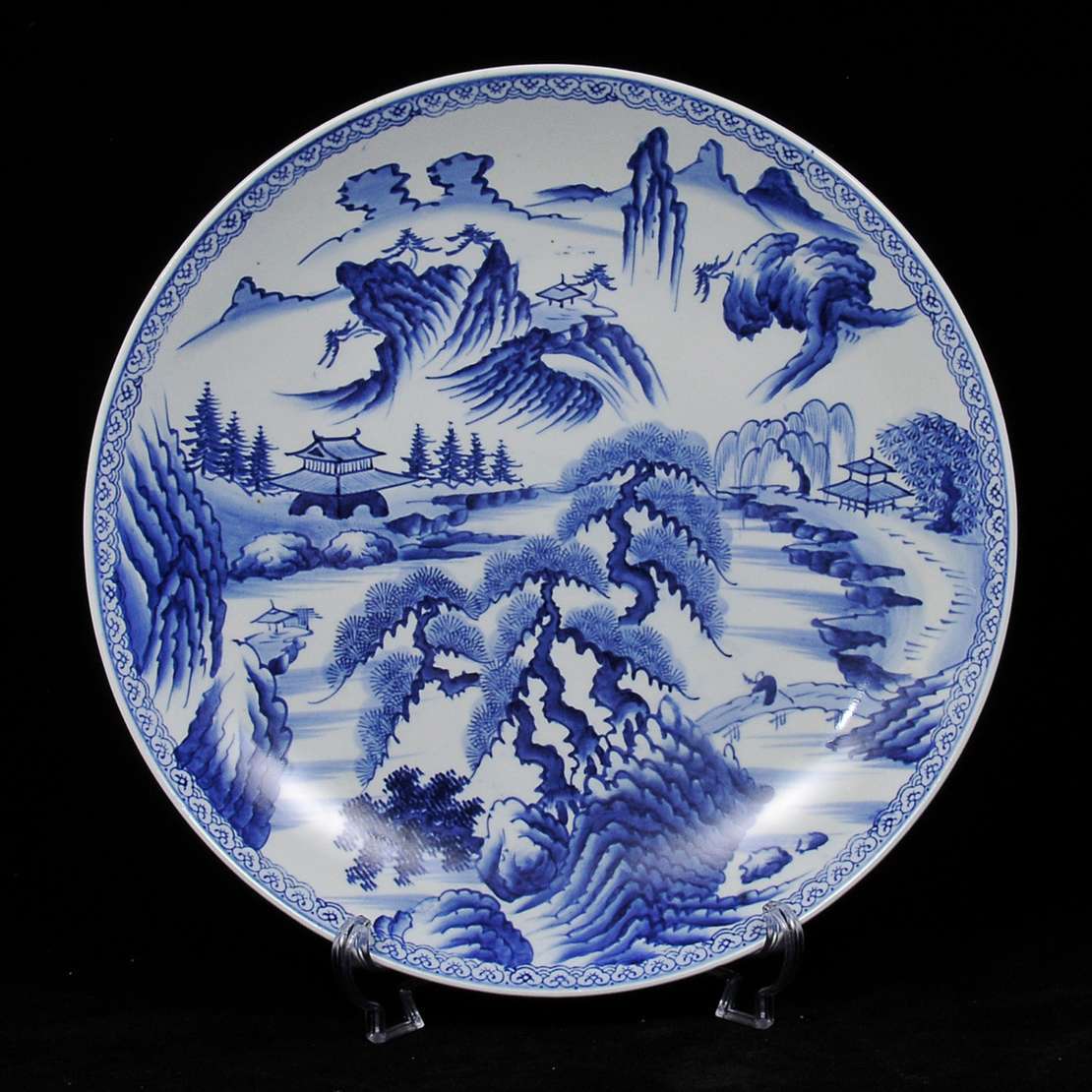 Medalhão em porcelana japonesa, decorado em azul com paisagens e borda estilizada.