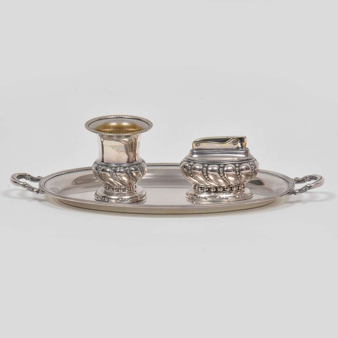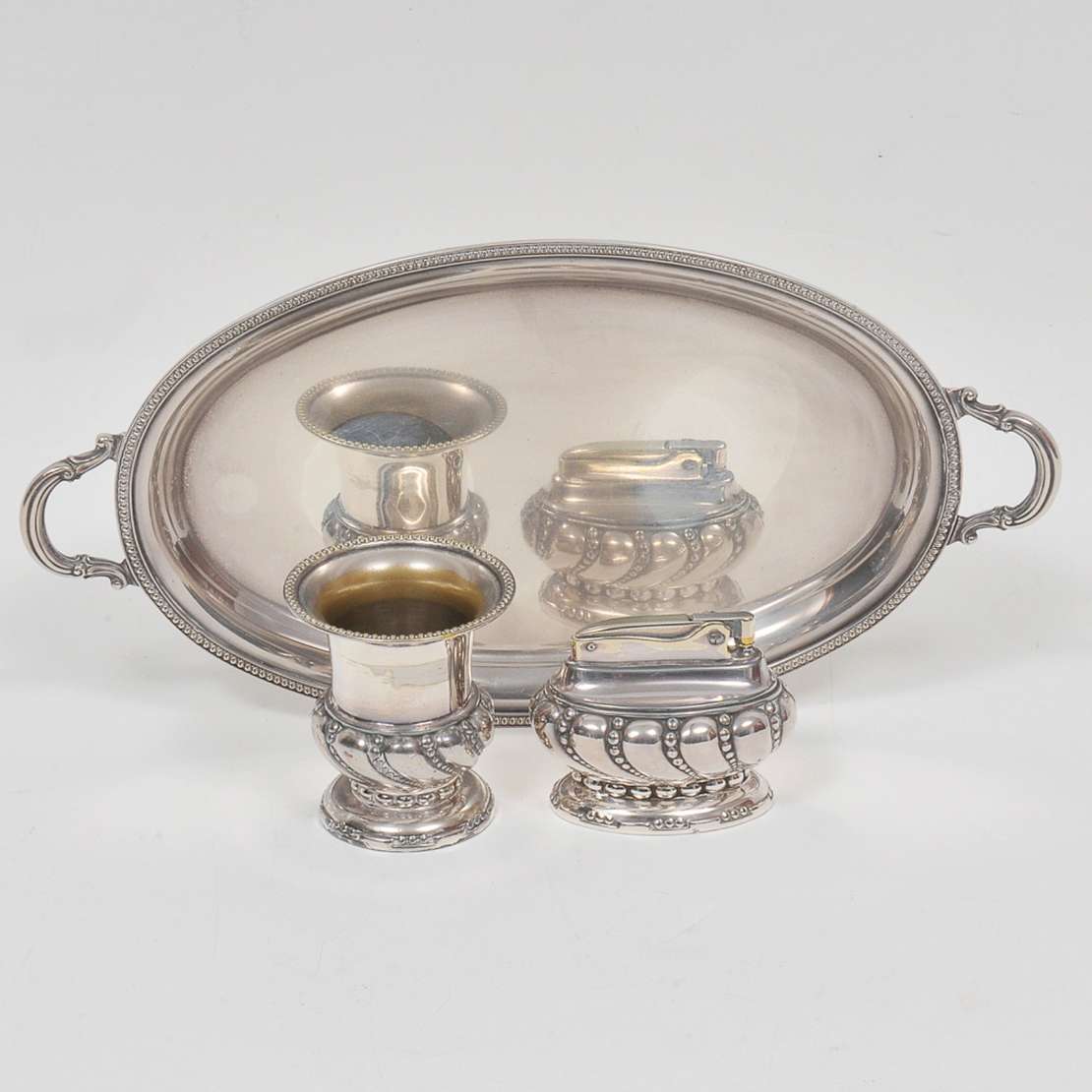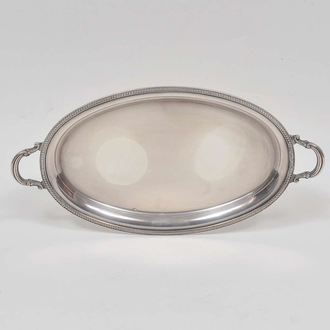 Conjunto de 2 travessa ovais em metal prateado. Uma com borda em torsade e marca "Band-Plate", da loja Joe & Jack Ban...