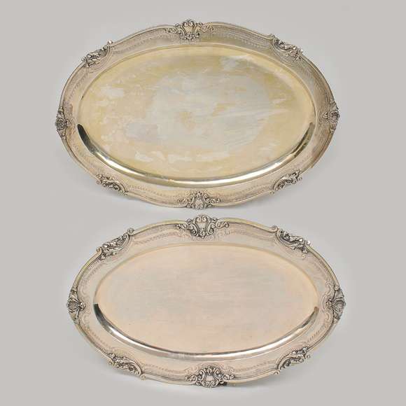 Duas travessas ovais idênticas de tamanhos diferentes em meta prateado repuxada e cinzelada - Bordas recortadas por l...