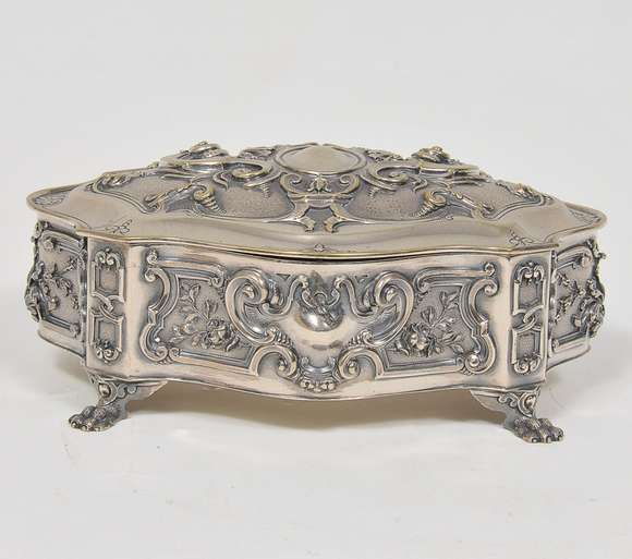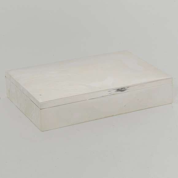 Caixa retangular em prata italiana repuxada e cinzelada, ornamentada por folhagens, volutas e concheados, centralizando reserva na tampa. Bordas com frisos em godrões. Contraste italianos de Bologna e do teor 800 mls, marca do prateiro Codevilla - Séc. XX