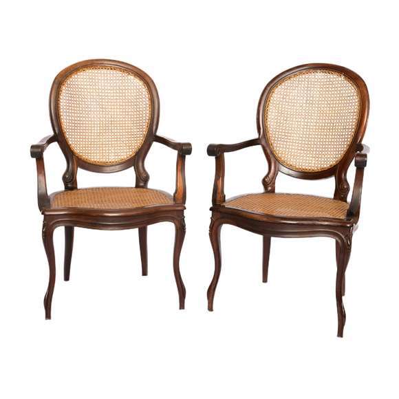 Par de cadeiras de braço em madeira nobre, assento e encosto forrado em palhinha natural, encosto encimado por florõe...