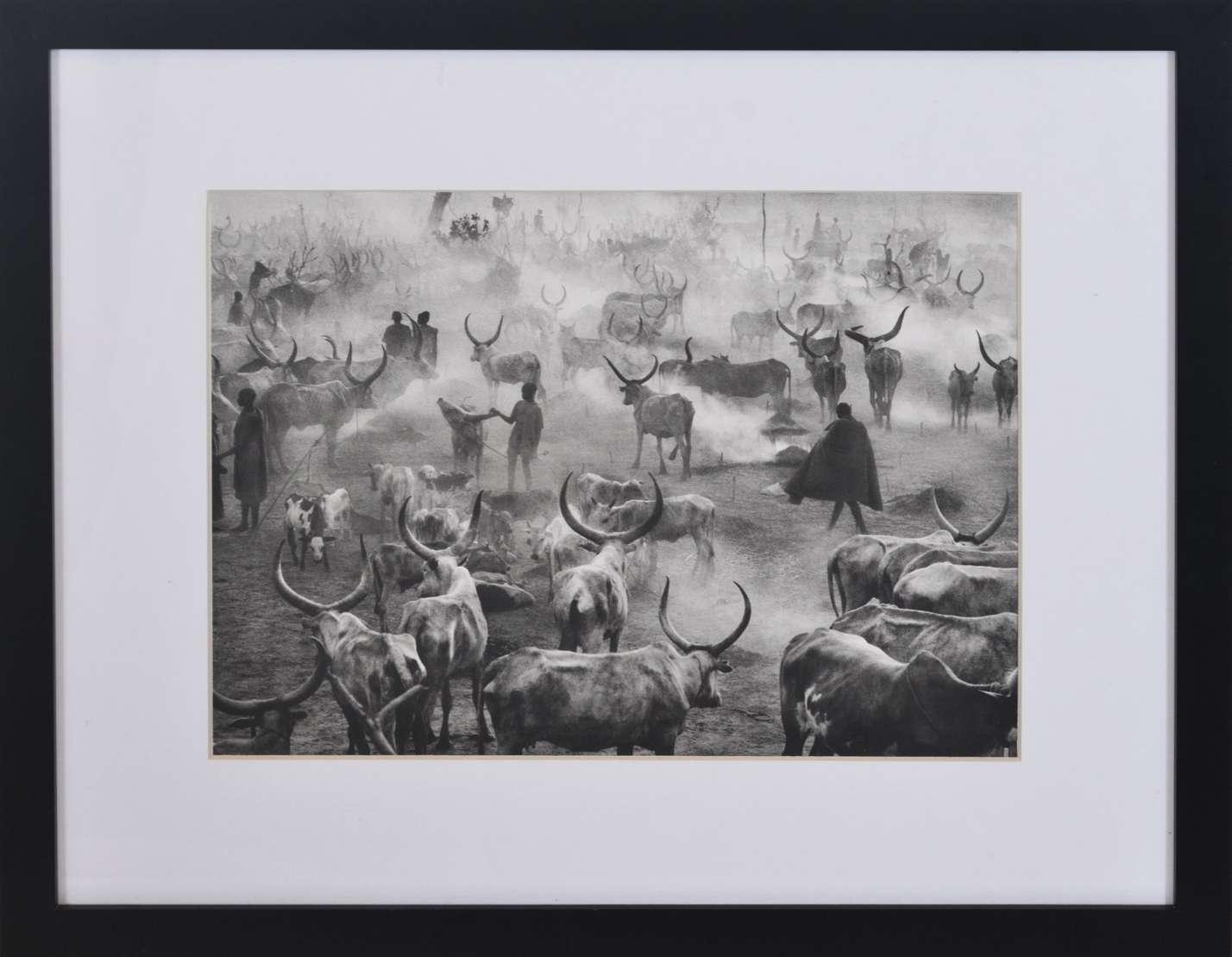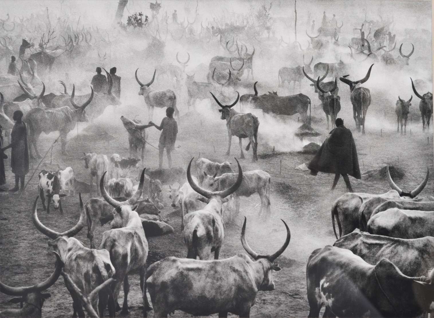 Impressão da edição de 2014 da renomada editora Taschen, assinada no verso. A fotografia foi capturada em 2006 e integra o monumental projeto "Genesis" do fotógrafo. A imagem retrata o povo Dinka, um dos maiores grupos étnicos do Sudão do Sul, evidenciando sua conexão intrínseca com o gado de chifres longos, um símbolo central da sua cultura. Este gado não apenas representa status social, mas também exerce um papel fundamental como moeda de troca em dotes de casamento e em diversos rituais, ilustrando a profundidade da tradição e dos valores desse povo.
