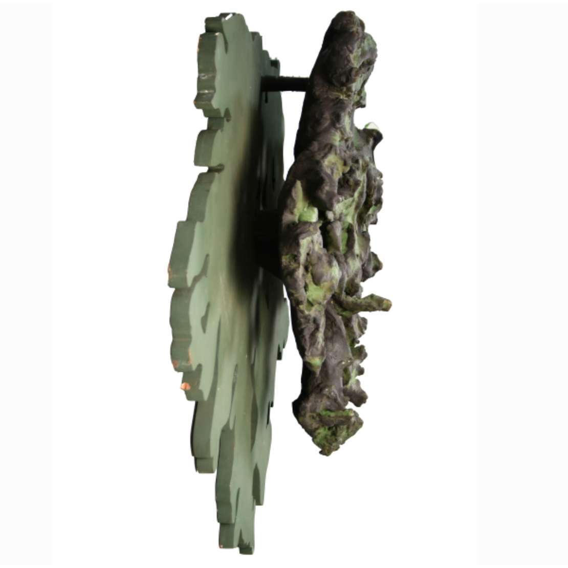 Escultura em bronze Apresenta dois lados, sendo uma face em bronze dourado e outra em bronze esverdeado. Ass. na peça